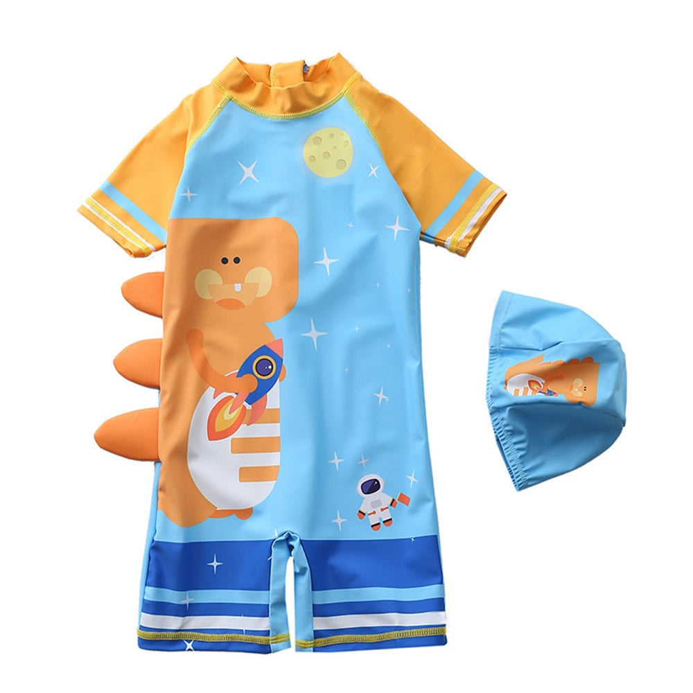 Macaquinho de Praia Infantil Manga Curta Dino Astronauta a combinação perfeita de proteção e fofura para os momentos de praia e piscina. Com um macaquinho charmoso e uma touca fofa, seu pequeno estará pronto para se divertir com segurança sob o sol!